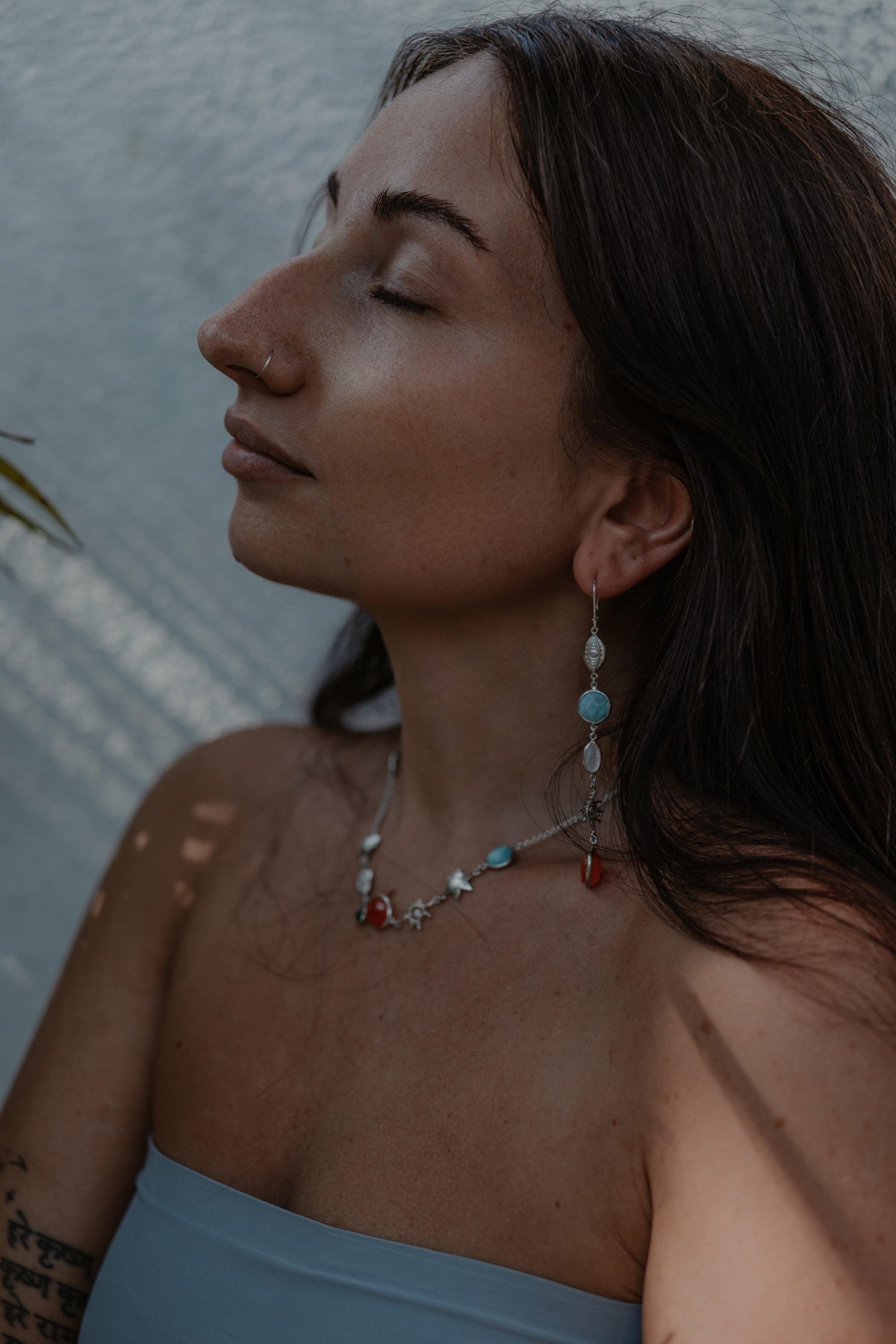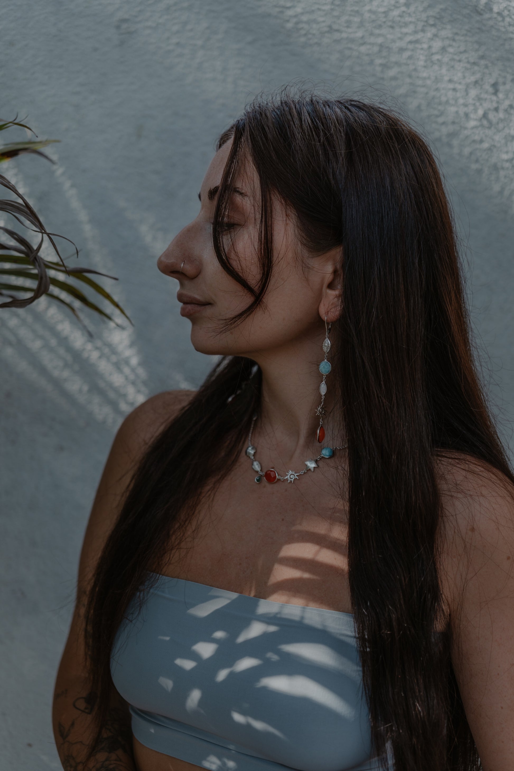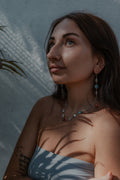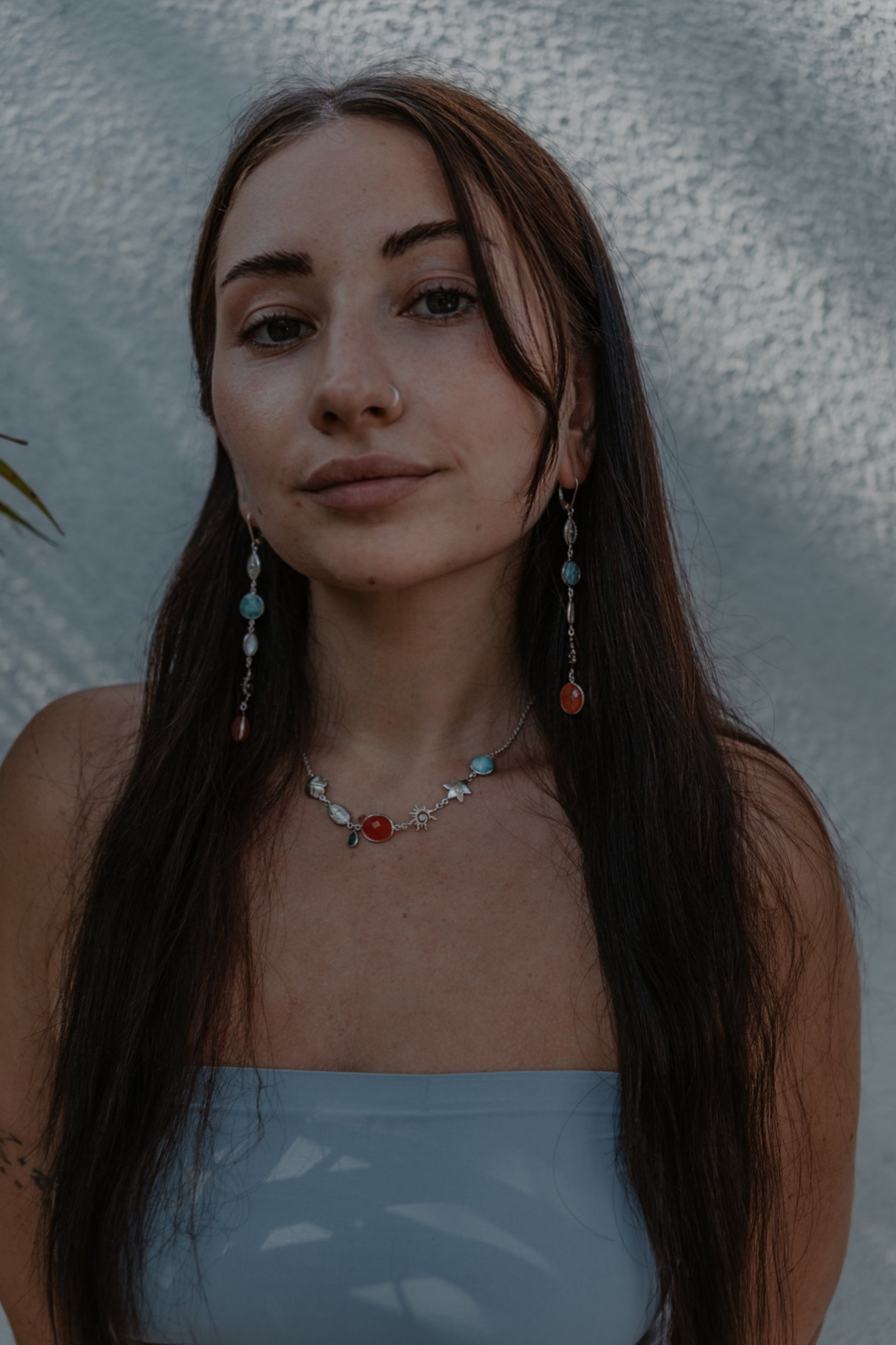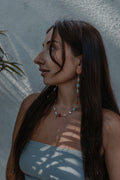 This stunning necklace is crafted with carnelian gemstone that symbolizes the fiery hues of a sunset, the emerald that brings love with its deep green beauty, the larimar only found in DR, and mother of pearl symbol of femininity.