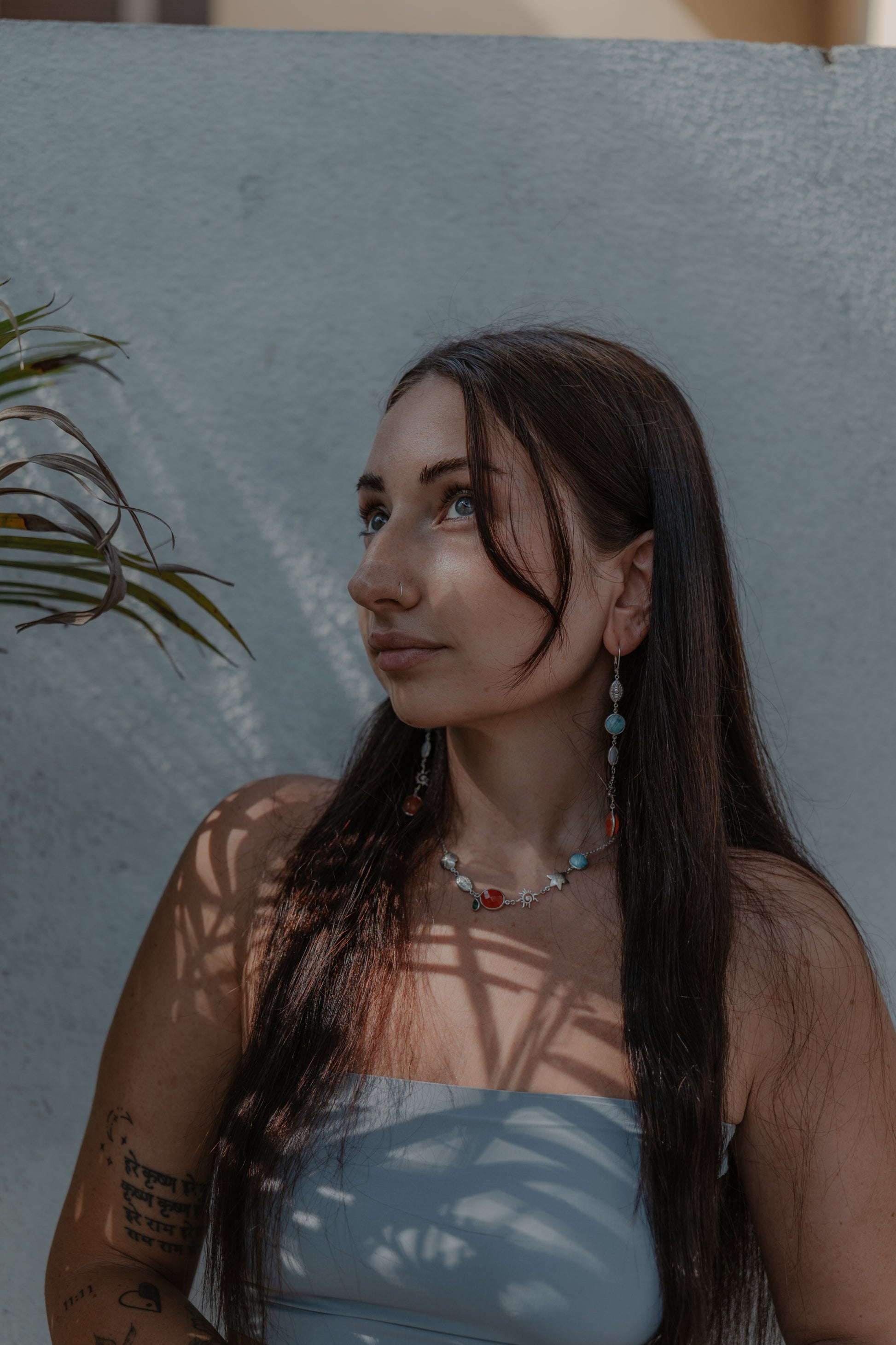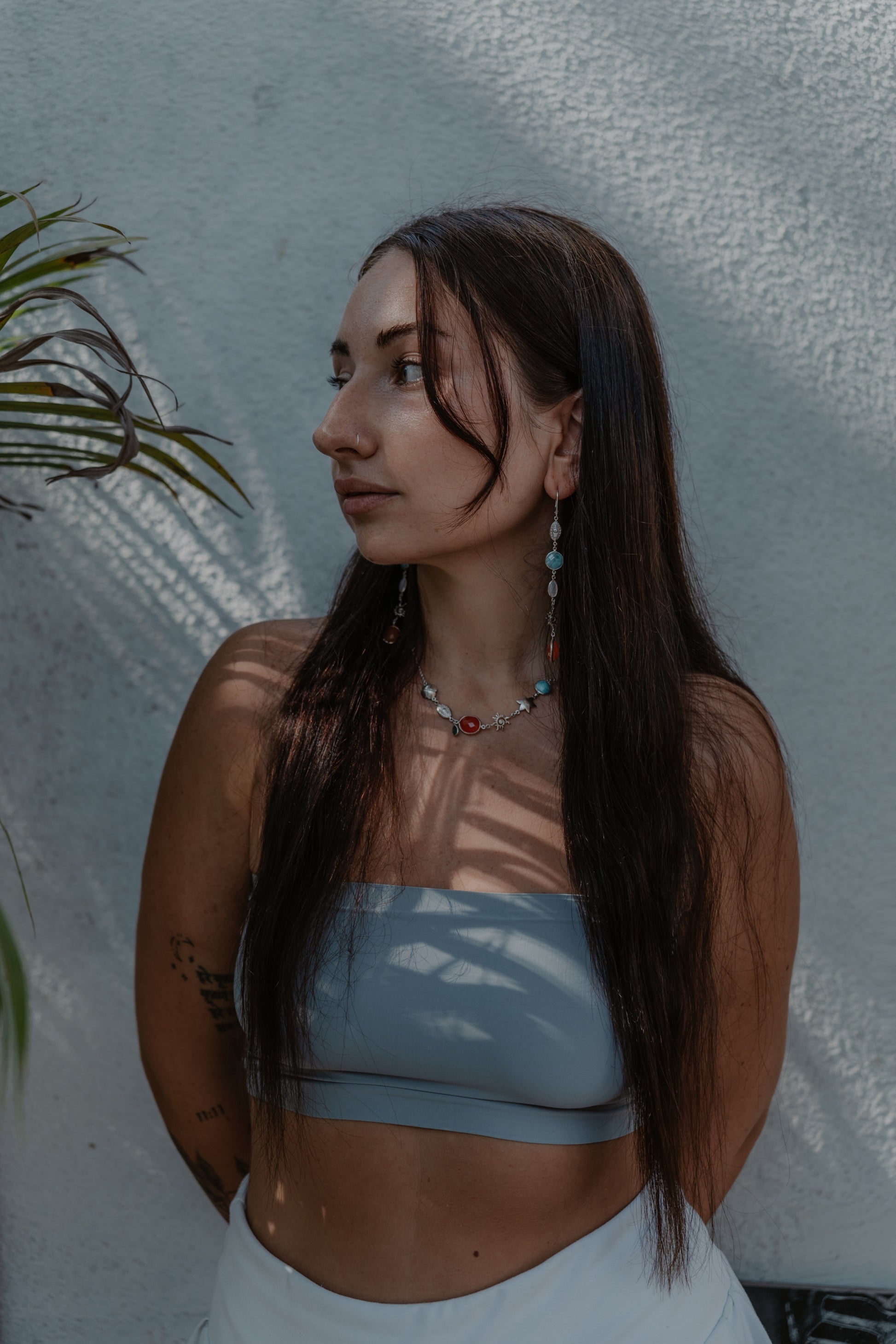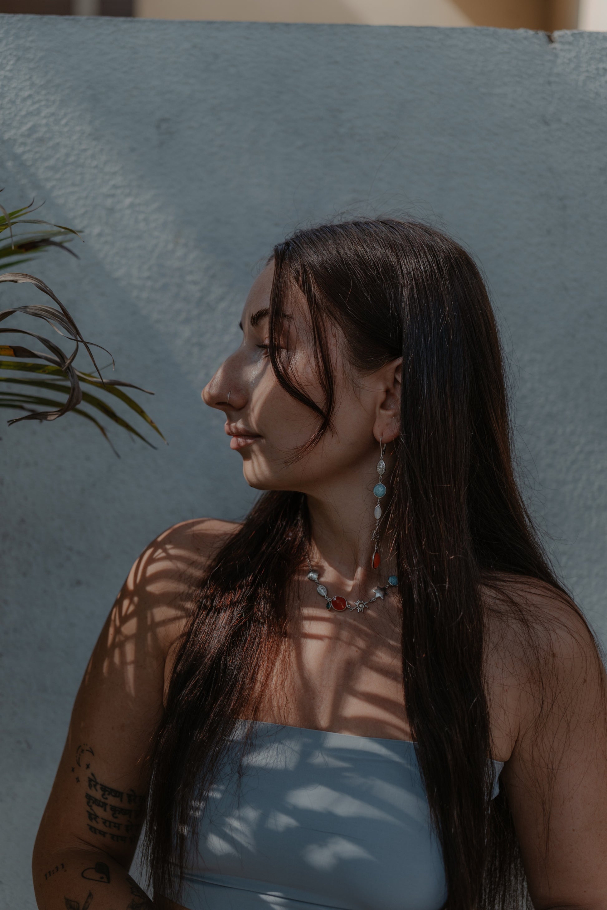 This stunning necklace is crafted with carnelian gemstone that symbolizes the fiery hues of a sunset, the emerald that brings love with its deep green beauty, the larimar only found in DR, and mother of pearl symbol of femininity.
